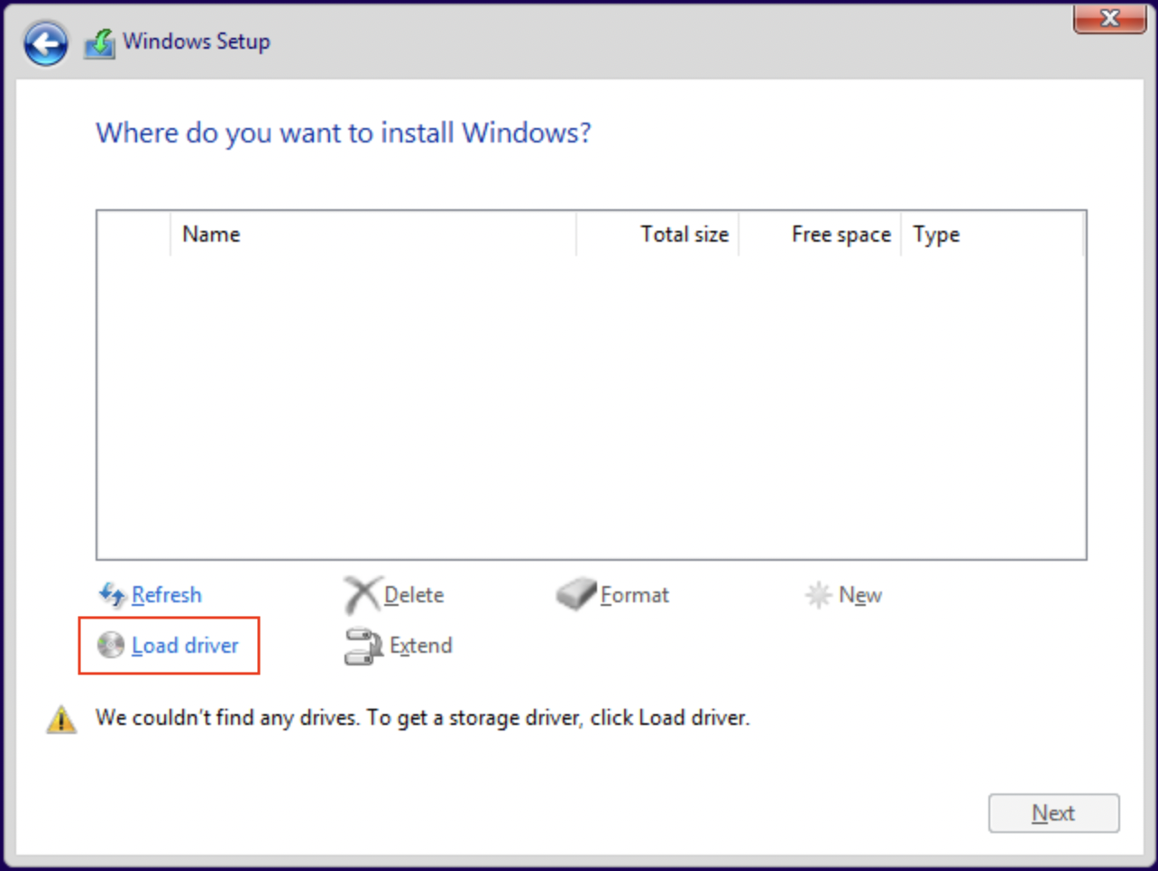 • You should now see the disk selection screen without any available disk. This is because Windows cannot use the virtio disks without adding drivers during the installation process.