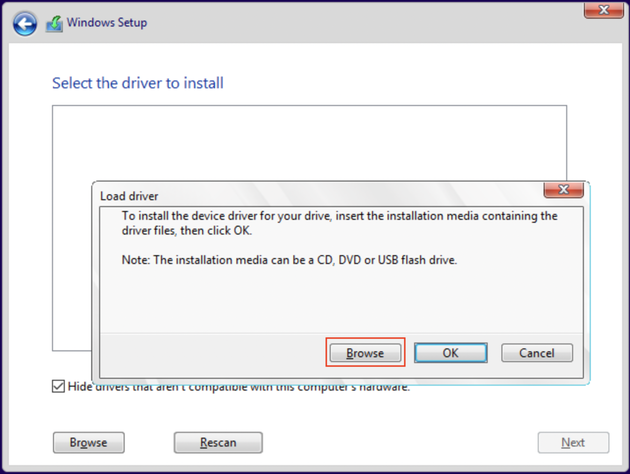 • To install the required drivers, select the 'Load Driver' button, then select 'Browse' to open a file-explorer from which to choose the install media.