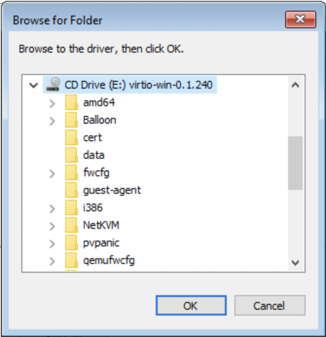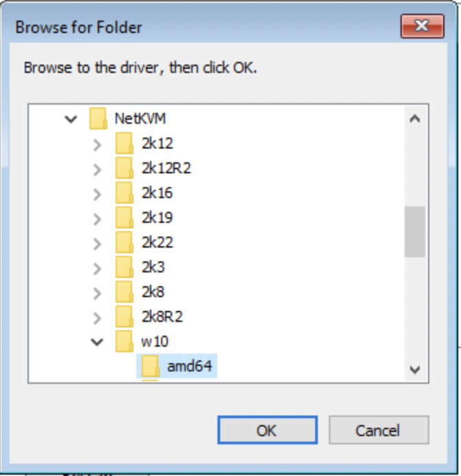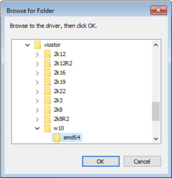 • Find and select the 'Viostor' directory, then choose the directory that corresponds to your operating system version. Choose the 'amd64' directory inside and click 'OK'.
