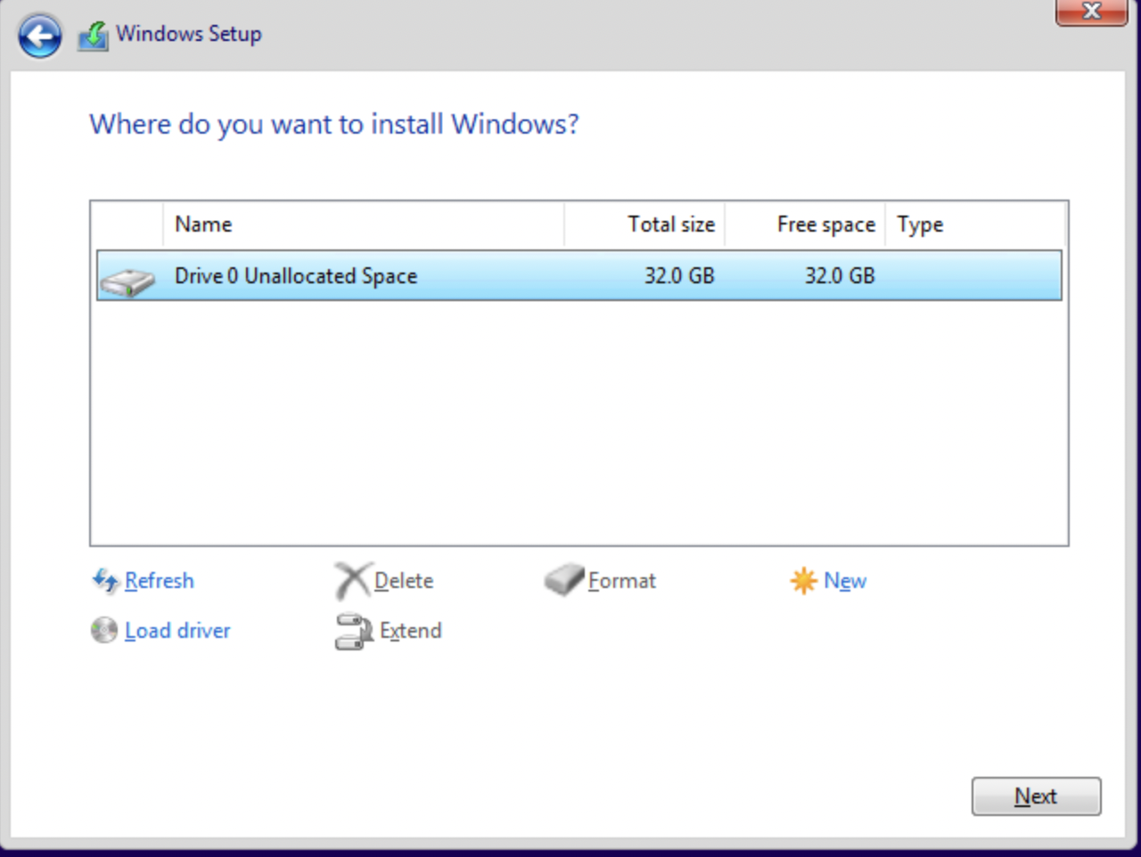 • With the drivers installed, we are now able to format and partition our virtual disk. Select 'Drive 0' then click 'new'.