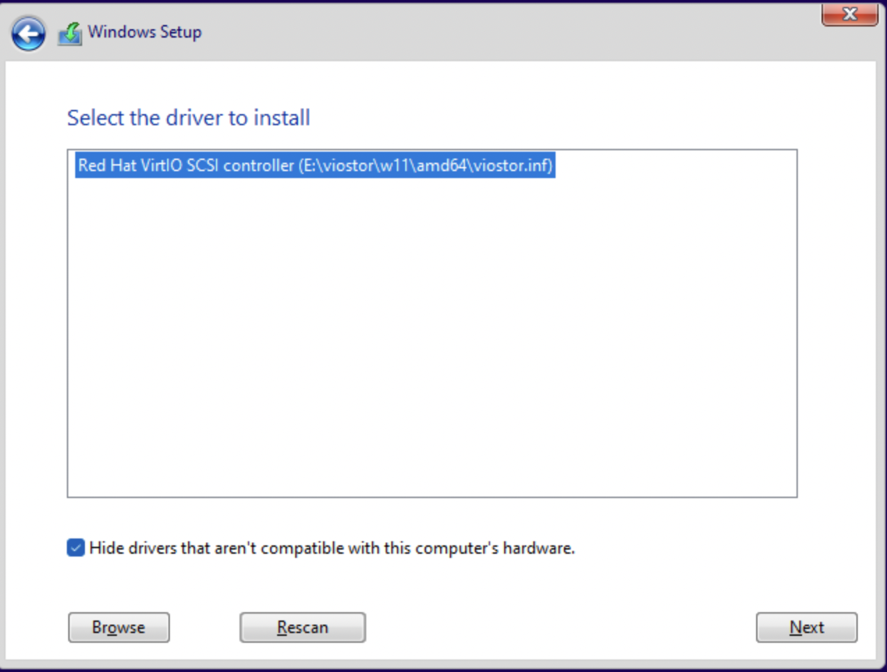 • The drivers are located in disk drive 'E' which should be named 'virtio-win-[version]'