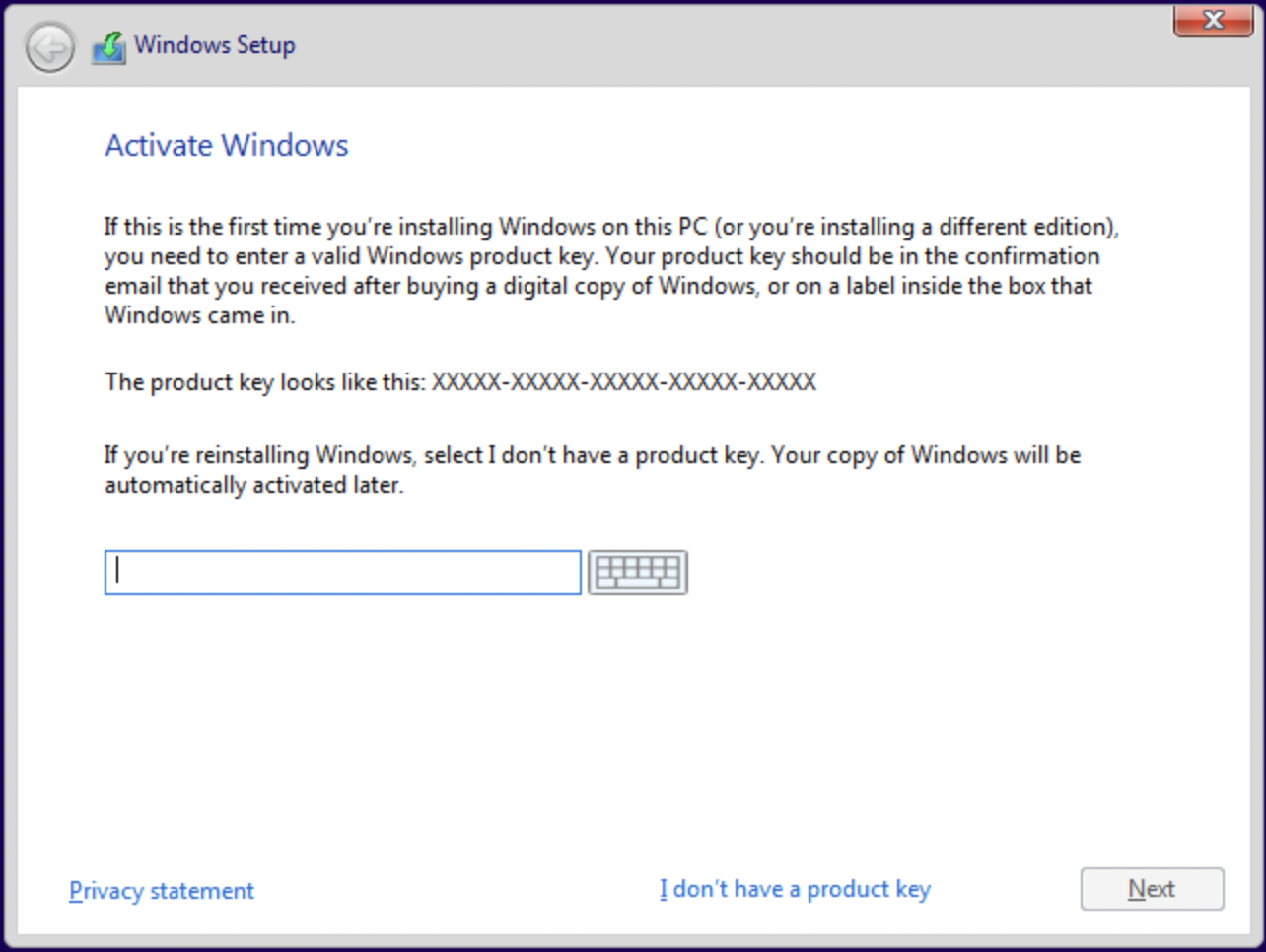 Enter your key or select "I don't have a product key" to skip.