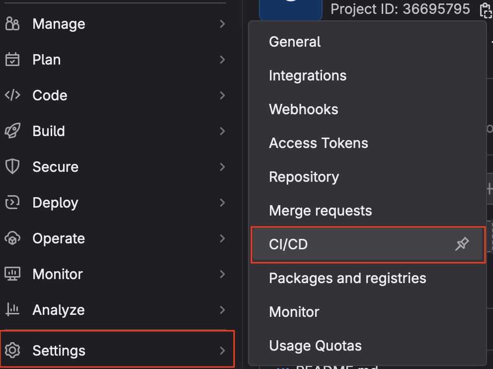 1. From the menu on the left, select Settings then choose CI/CD from the pop-out list.