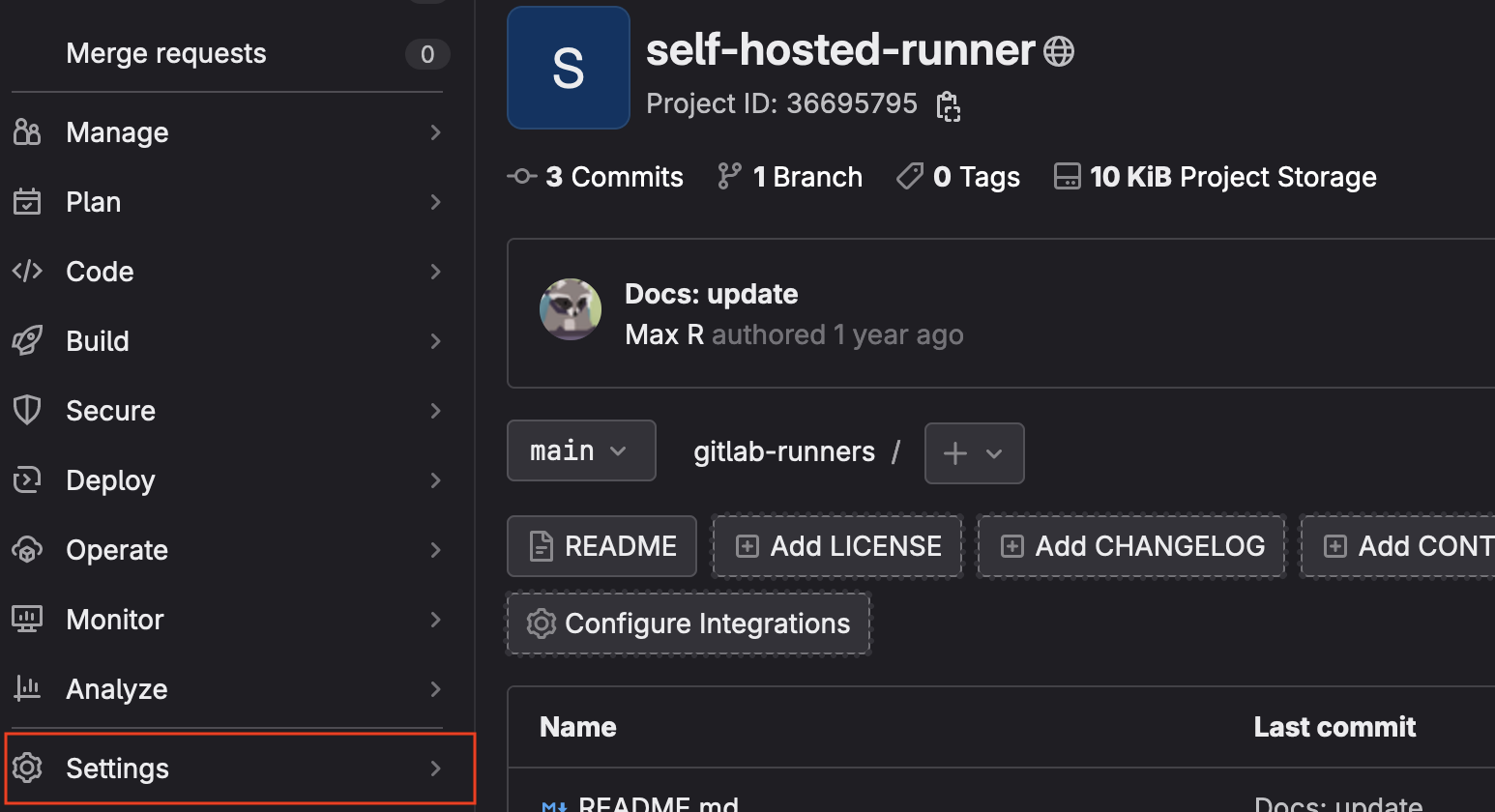 2. Log in to Gitlab and navigate to the repo you want to create a runner for